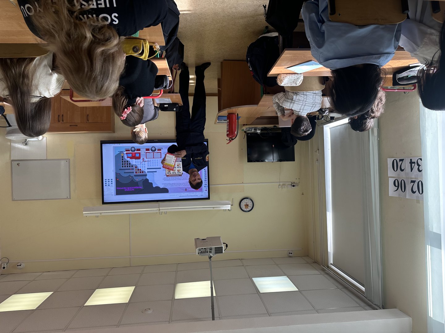 Заместитель начальника отряда остановился на костюме огнеборца, который делают из особых материалов, выдерживающих температуру до 1 200 °С Цельсия и защищающих человека от концентрированных кислот и щелочей, препятствуя их впитыванию. Информация о том, что вес костюма и снаряжения пожарного варьируется от 5 до 30 килограммов в зависимости от того, из чего он сделан и что входит в экипировку, вызвала удивление и восхищение учащихся.